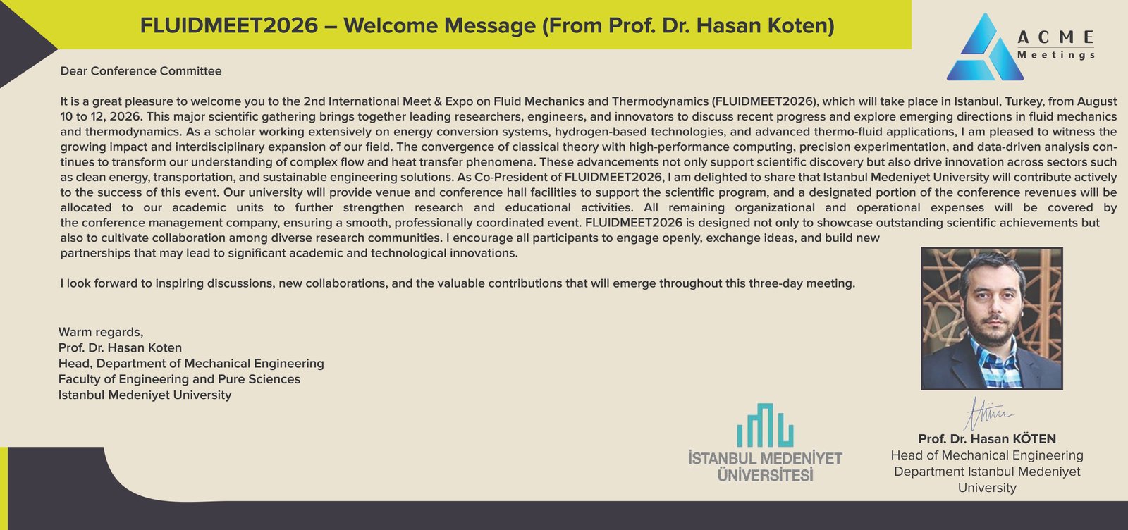 FLUIDMEET2026 will take place at the Conference Hall of Istanbul Medeniyet University, one of Turkey’s most prestigious academic institutions located in the heart of Istanbul. The university’s modern infrastructure, advanced research environment, and well-equipped facilities make it an ideal setting for an international scientific gathering.